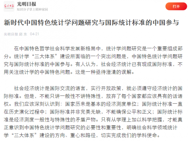 4月21日,《光明日报》11版刊登统计欧美av 讲席教授邱东的文章《新时代中国特色统计学问题研究与国际统计标准的中国参与》。
