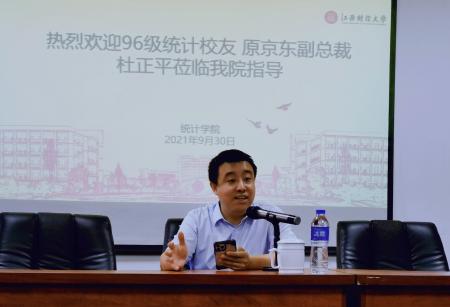 9月30日上午,应统计欧美av 邀请,96级统计校友,原京东副总裁杜正平莅临欧美av指导,在蛟桥北区综合楼313会议室为统计欧美av 师生带来一场题为“数字时代——新的时代”的专题讲座,本次讲座由统计欧美av 党委书记陶春海主持,统计欧美av 部分教师和研究生参加了此次讲座。