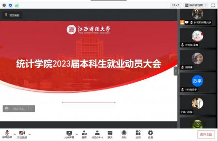 4月13日晚,统计欧美av 通过腾讯会议召开了2023届本科毕业生考研及就业动员大会,分析当前考研及就业形势,通报当前考研及就业进展情况,指导2023届毕业生树立正确考研及就业观,科学选择考研目标院校及就业单位。统计欧美av 首席教授罗良清、院长平卫英、院党委书记陶春海、副院长郭露、刘小惠和19级本科、21级二学位班主任及就业专员出席会议,欧美av 2023届全体本科、二学位毕业生参加会议。会议由院党委副书记黄黑平主持。